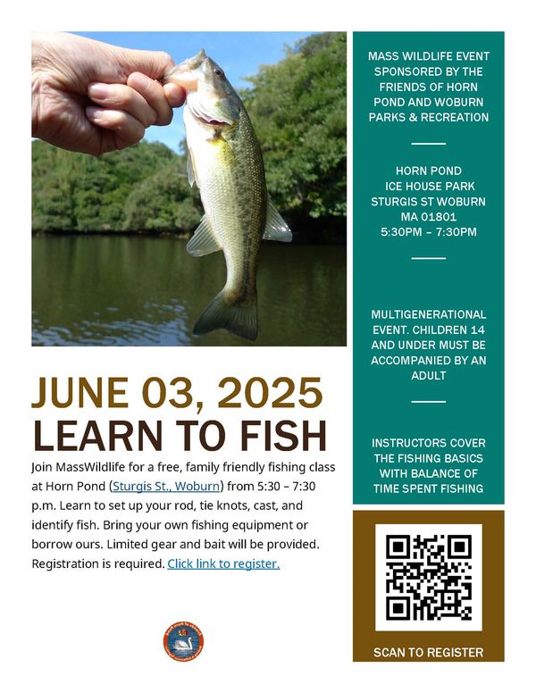 We are proud to partner with MassWildlife and Woburn Recreation to host the annual Learn to Fish class at Horn Pond. The class is family friendly for all ages. It is taught by the state Angler Education Coordinator and a team of angler experts. Learn to set up your fishing rod, tie knots, cast, and identify fish. Proper disposal of fishing line, hooks, and lures is discussed as part of the class.