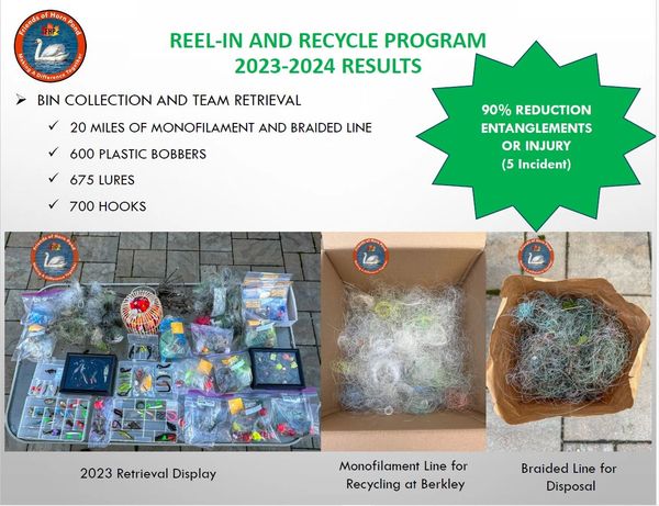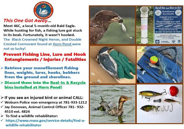 Horn Pond is the public drinking water supply watershed for Woburn. It is the home to thousands of plants, bird, and animal species. Monofilament fishing line is a razor thin plastic material that takes up to 600 years to biodegrade in the environment leaving an infinite amount of microplastics behind. If left on the ground, in water, along shorelines, in trees, and bushes then it can lead to entanglements of wildlife, pets, and people causing injuries and, in some cases, death. Hooks and lures can lead to puncture wounds causing life threatening injuries. Bobbers become broken leaving plastic shards on land and in the water. All combined it adds a significant risk to the health of entire ecosystem.